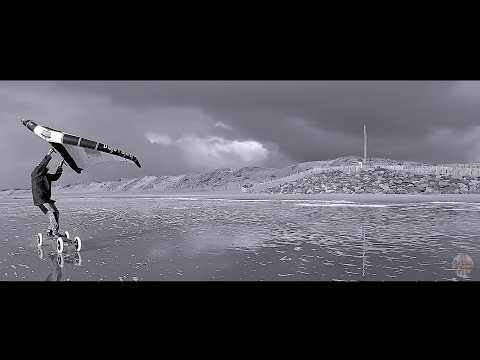 Wing surfing with landboards on the beach — a black-and-white video from France. Thierry and Dom are really going for it and even zoom through the washed-up beach.